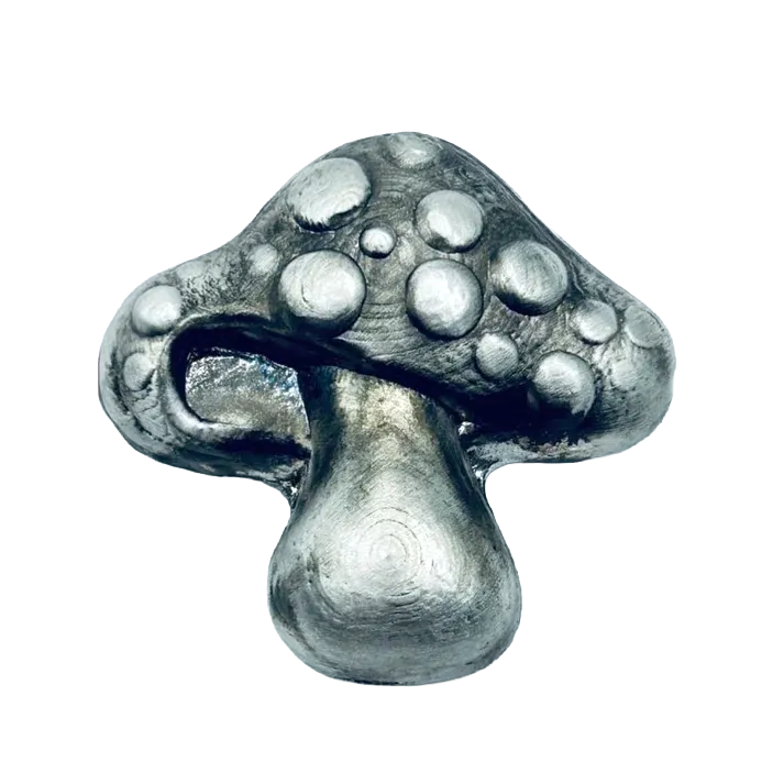 A standout in silver artistry, this 2 oz .999 fine silver MK BarZ creation is hand-poured into a whimsical mushroom shape, playful, yet refined. Crafted with expert precision, it combines investment-grade purity with imaginative design. Whether you're building a meaningful stack or seeking a singular conversation piece, this collectible blends charm, character, and value in one unforgettable form.
